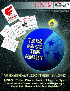 Take Back the Night at UNLV Oct. 17 Emmily Bristol / October 8, 2012 Passing this along from our friends at the UNLV Women’s Center: Share this: Click to share on Facebook (Opens in new window) Facebook Click to share on X (Opens in new window) X Click to email a link to a friend (Opens in new window) Email Click to share on Reddit (Opens in new window) Reddit Like Loading...