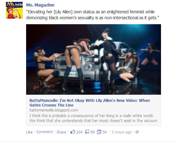 The video is meant to be a critique and satire of popular culture and manages some deserved jabs at Robin Thicke’s “Blurred Lines” videos among others, but in the end it just reduces itself down to elevating Lily Allen’s white female body and objectifying and utterly denigrating those of the black female dancers she deliberately surrounds herself with from start to finish.