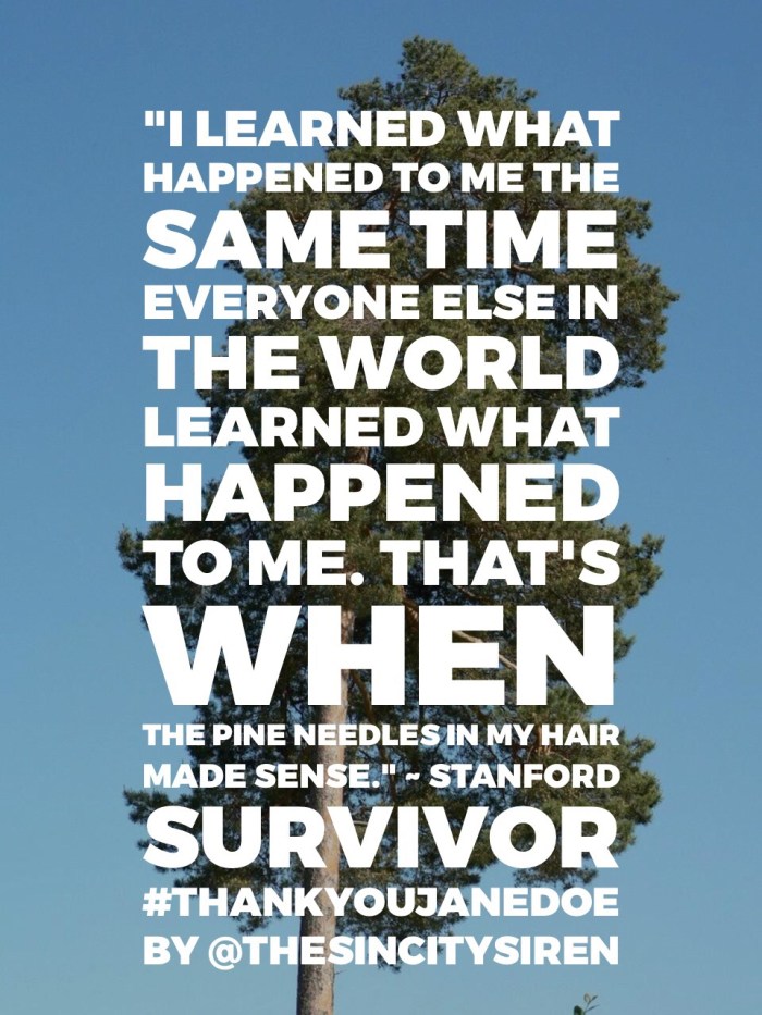 Thank you, Jane Doe. Thank you for your courage in facing such an unfairly brutal trial. Thank you for giving a voice to the millions of women in the world who have been sexually assaulted. You are brave, empowering symbol for all women. Inspired by your letter, I am emblazoned to anger against each and every person who trivialized your assault, as I have been for the countless women whose similar stories have been shared with me over the years. I wish I could be in California, standing on the steps of the courthouse with a big sign, demanding that Turner receives a harsher sentence. I am several states away, however, I can promise you this: I will speak out against any sexually based crime and I will welcome any victim to seek my out for safety and support.